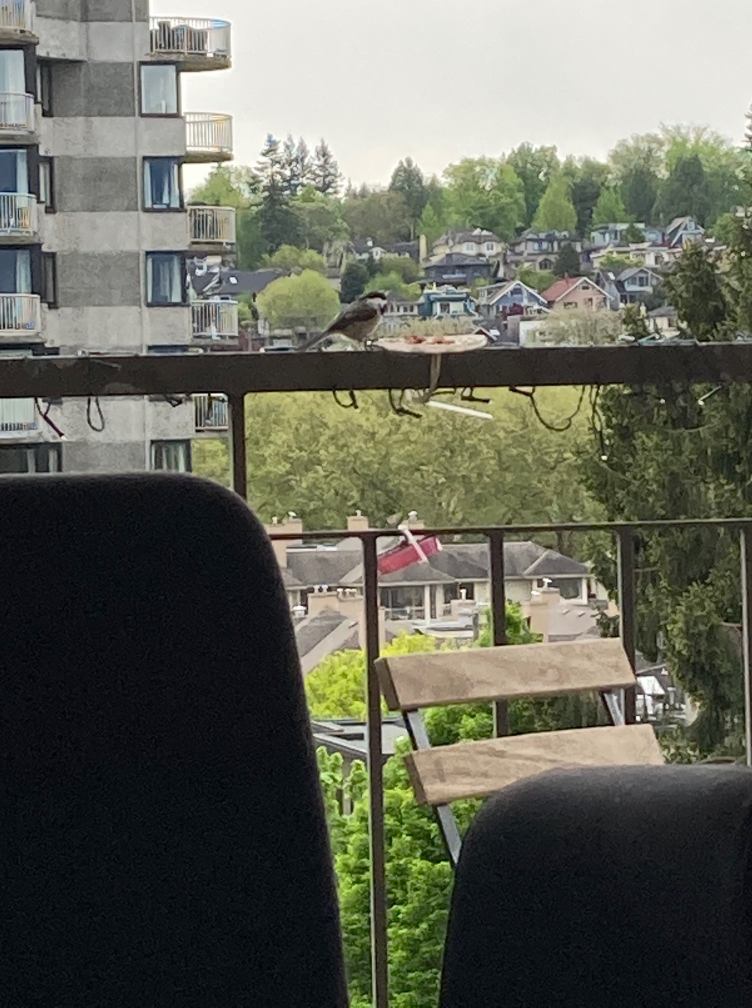 Tom set about leaving nuts on the balcony railing to see if he could attract a crow. On the eighth floor you’re never sure how comfortable birds will be coming to feed here, but we’ve been very successful with hummingbirds so figured it was worth a shot. Sure enough, after a few weeks we started having a crow regularly come and feed. As time has passed we have indeed befriended a crow, and even seen it territorially guard our balcony against another much larger crow! It’s been fascinating watching the behaviour.
