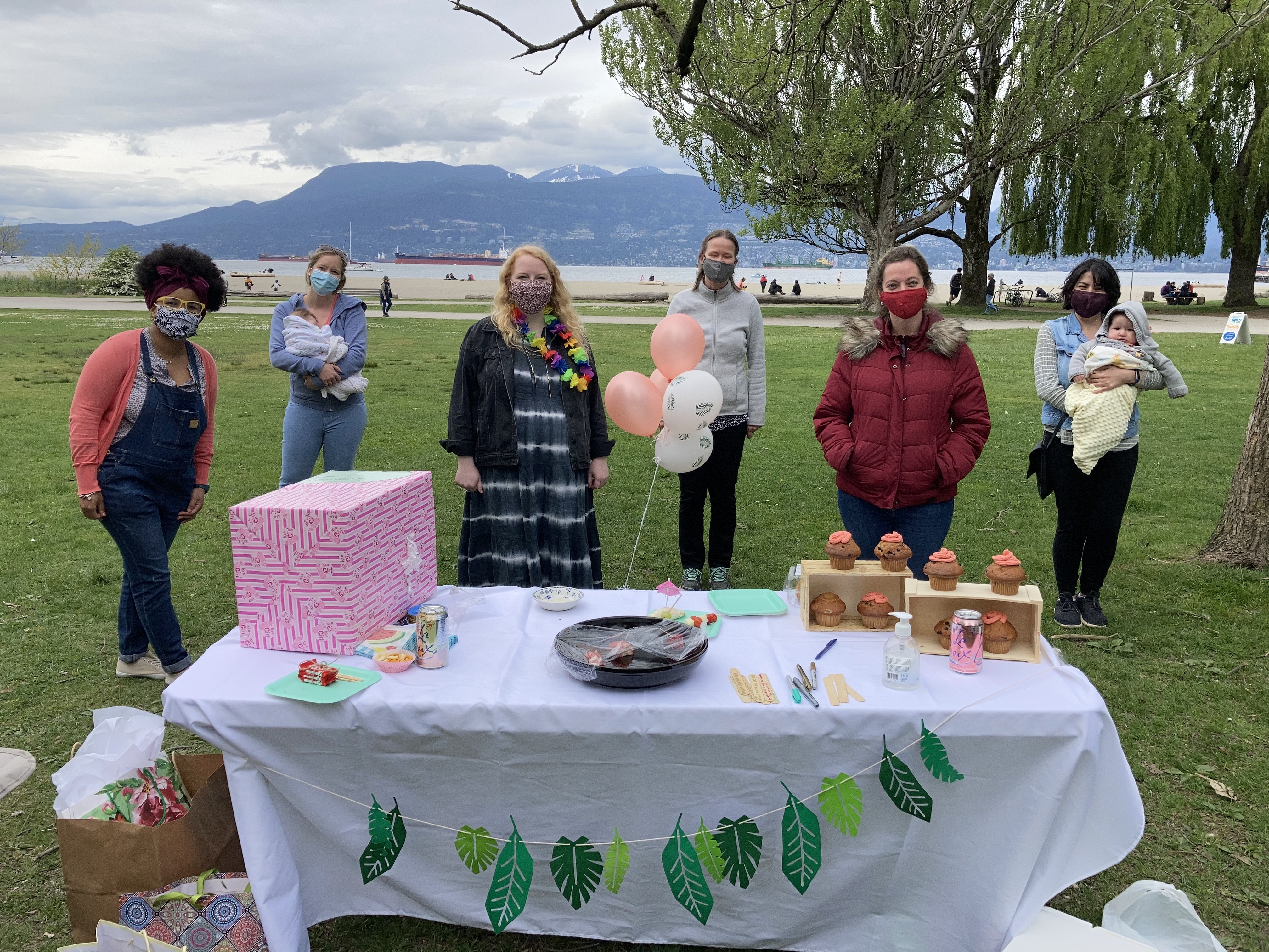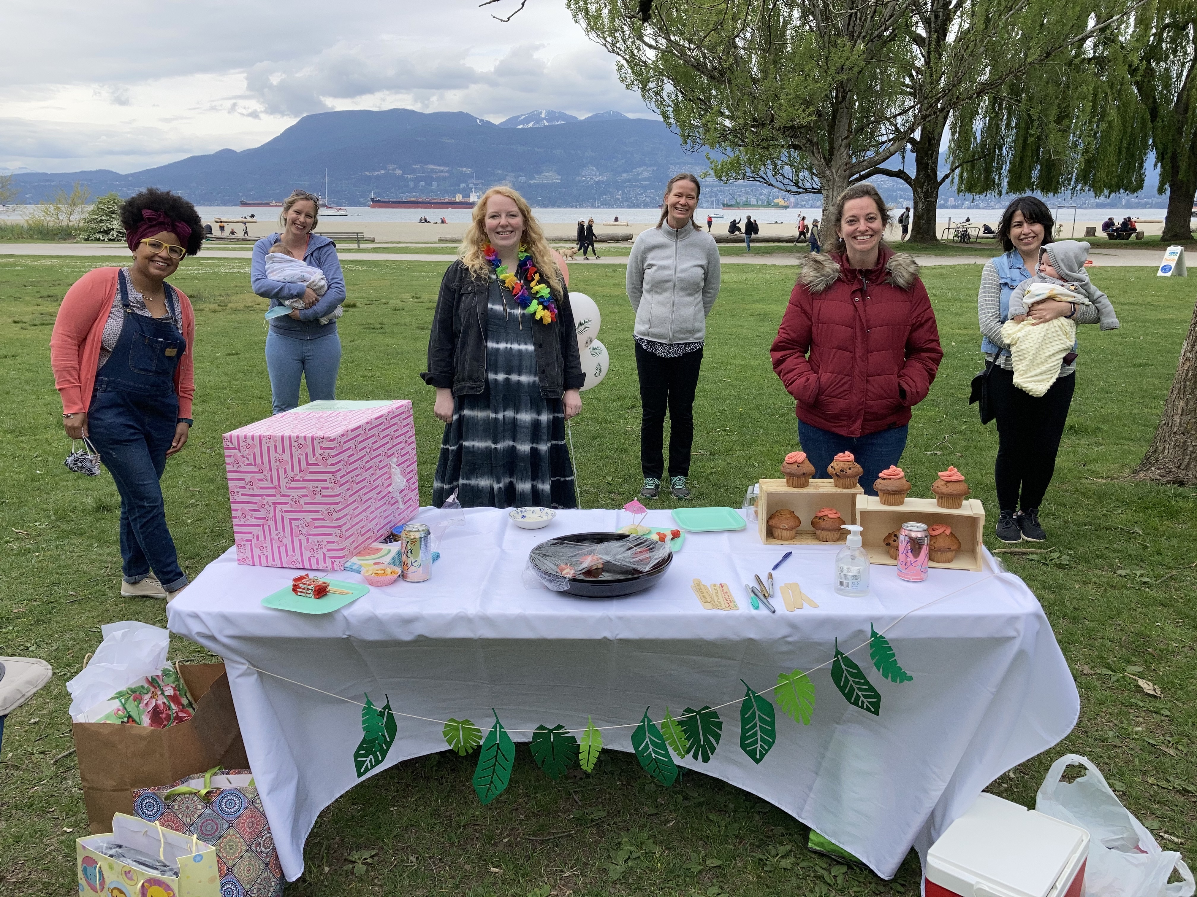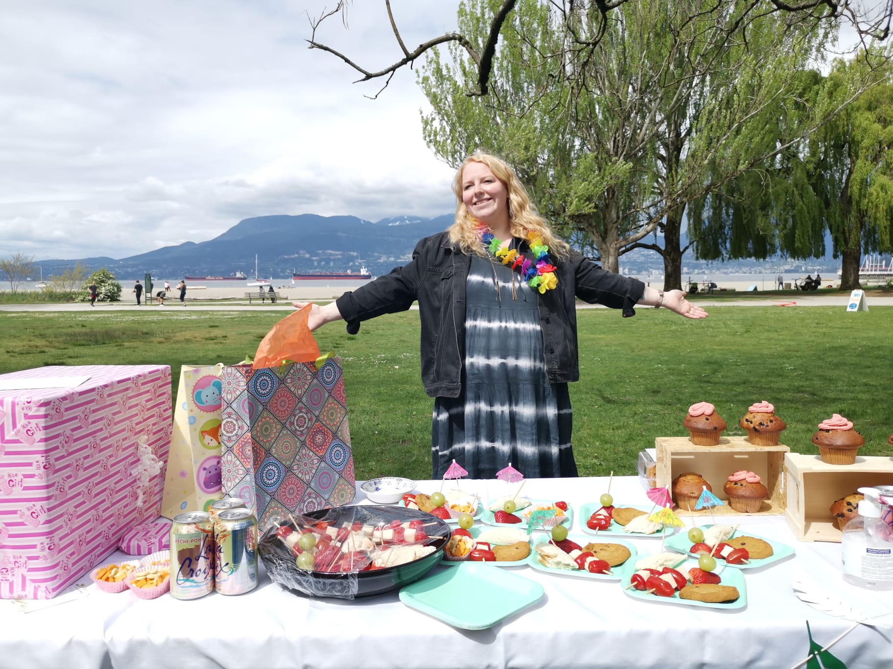 I love Jericho Beach so suggested we do it there, and made a guest list of 10 people – which included babies and myself. Leidy (who organised the whole thing) asked if I had a theme in mind and I didn’t, so just said to keep it relaxed and beachy… she came out with all this awesome tropical decor, balloons and a lei for me – it was amazing! She brought pink iced cupcakes and made up individual plates of food so that all the guests could help themselves without any cross-contamination. And although it was a quite windy, it stayed dry for the whole afternoon and it only really clouded over as we wrapped up the games!