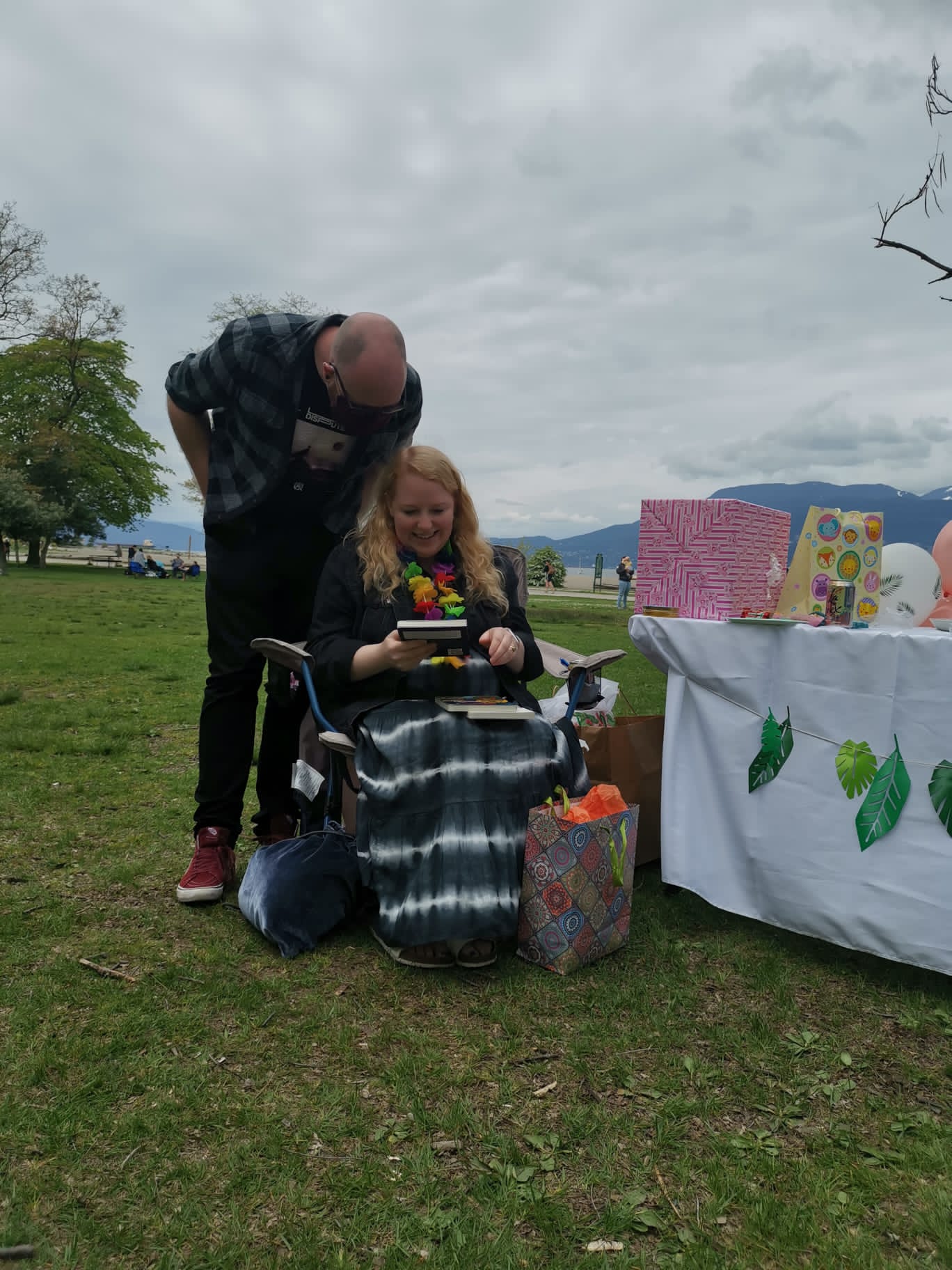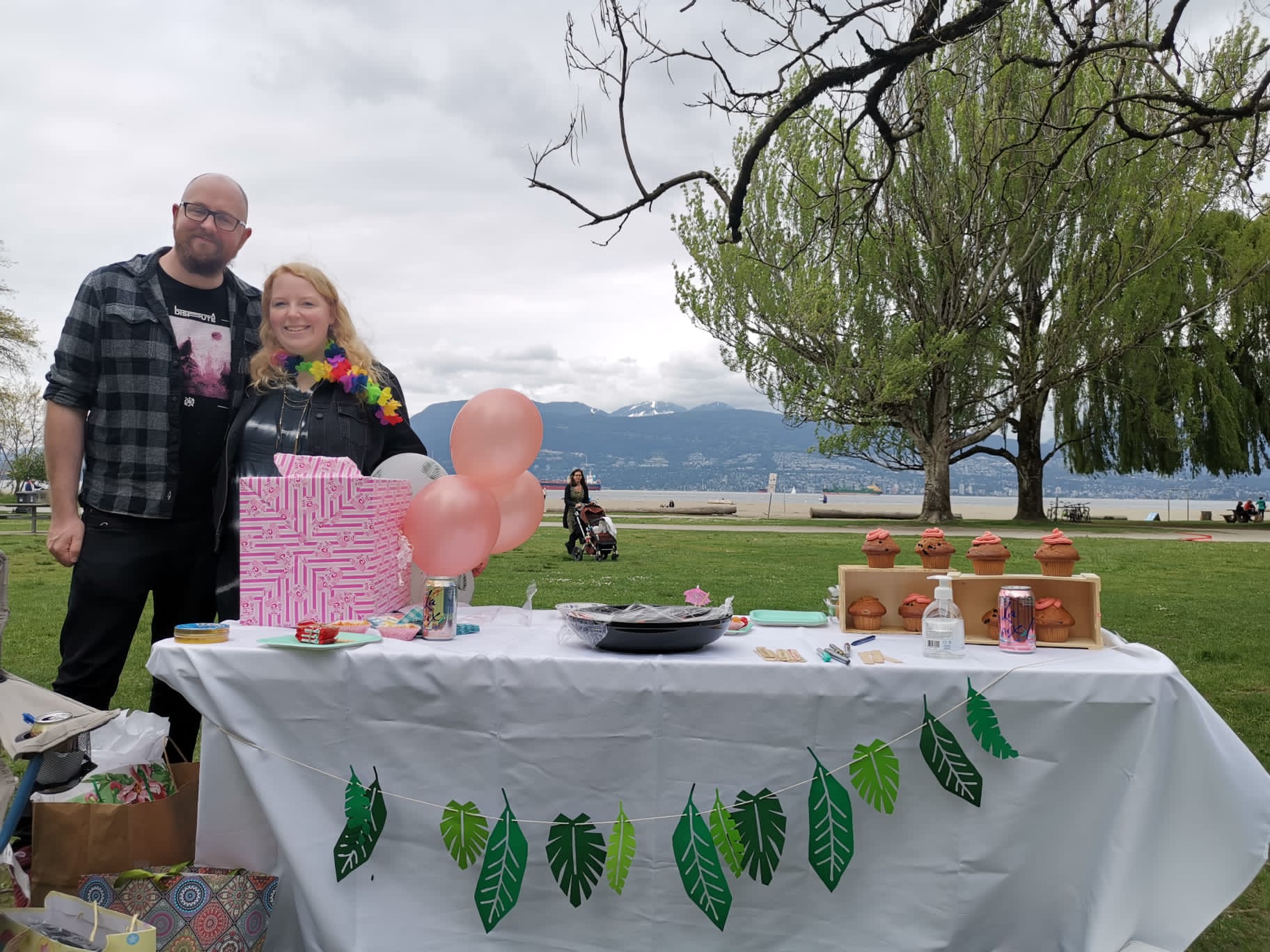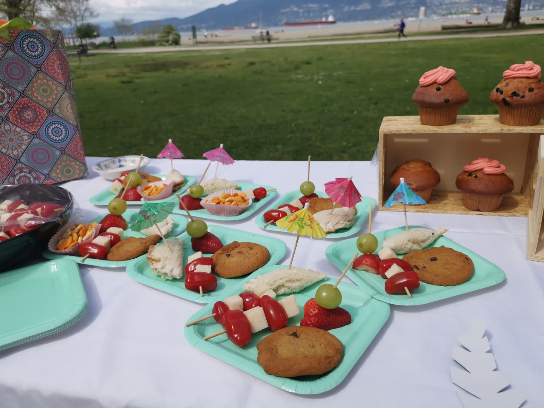 I love Jericho Beach so suggested we do it there, and made a guest list of 10 people – which included babies and myself. Leidy (who organised the whole thing) asked if I had a theme in mind and I didn’t, so just said to keep it relaxed and beachy… she came out with all this awesome tropical decor, balloons and a lei for me – it was amazing! She brought pink iced cupcakes and made up individual plates of food so that all the guests could help themselves without any cross-contamination. And although it was a quite windy, it stayed dry for the whole afternoon and it only really clouded over as we wrapped up the games!
